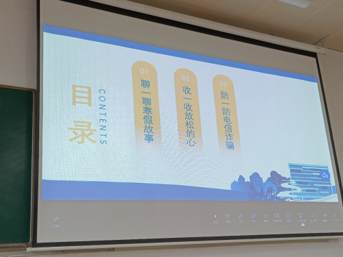 学期伊始,正是电信诈骗频发时期。班会最后,时润泽同学为大家再次普及反诈知识,提醒同学们时刻保持警惕,在涉及钱财交易时一定要再三确认,遇到问题第一时间与辅导员老师沟通,避免落入诈骗陷阱。