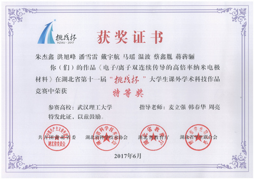 6月8日,湖北省第十一届“挑战杯”大学生课外学术科技作品竞赛终审决赛颁奖典礼在华中农业大学举行。成人动作片 报送的2件参赛作品《电子/离子双连续传导的高倍率纳米电极材料》和《印刷制备适用于微光环境的大面积高稳定性钙钛矿光伏器件》分别获得特等奖和一等奖,助力我校以团体总分全省第二的成绩荣获该项赛事“优胜杯”荣誉。成人动作片领导黄学辉副院长、赵春霞副院长、卢少平副书记以及材料学科各单位教师彭勇、安琴友、许絮、冯小平、吉晓莉、李娟娟、朱晓萌、冯玮、肖勇、曾鲜、刘俐、刘云鹏、欧阳韬源、熊远禄、田仕、沈国芳等到比赛展位现场进行了观摩和指导。