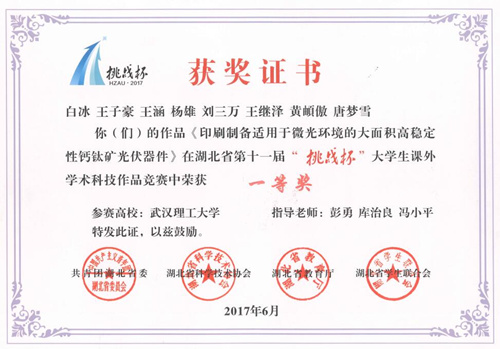成人动作片 一等奖作品-科技制作发明B类《印刷制备适用于微光环境的大面积高稳定性钙钛矿光伏器件》(指导老师:彭勇、库治良、冯小平;作者:白冰等)通过含Cs钙钛矿体系的引入提高了其热稳定性以及水稳定性。同时在封装过程中,向UV胶中添加合适比例的无机物,进一步提高了其隔绝水汽的能力,并且通过两步法工艺有效的改善了大面积成膜难的问题,制备出的钙钛矿光伏器件具有稳定性好、光电转换效率高等特点,能够有效利用无处不在的光能,节能环保,推动清洁能源的发展,符合可持续发展战略,对光伏行业有促进及革新意义,具有良好的研究价值,经济效益和社会效益显著。该项目成员拥有成果包括两篇发明专利受理,十篇实用新型专利受理,同时还和武汉市城市合伙人企业签订了合作意向书,受到武汉大学钱俊教授的亲笔推荐。