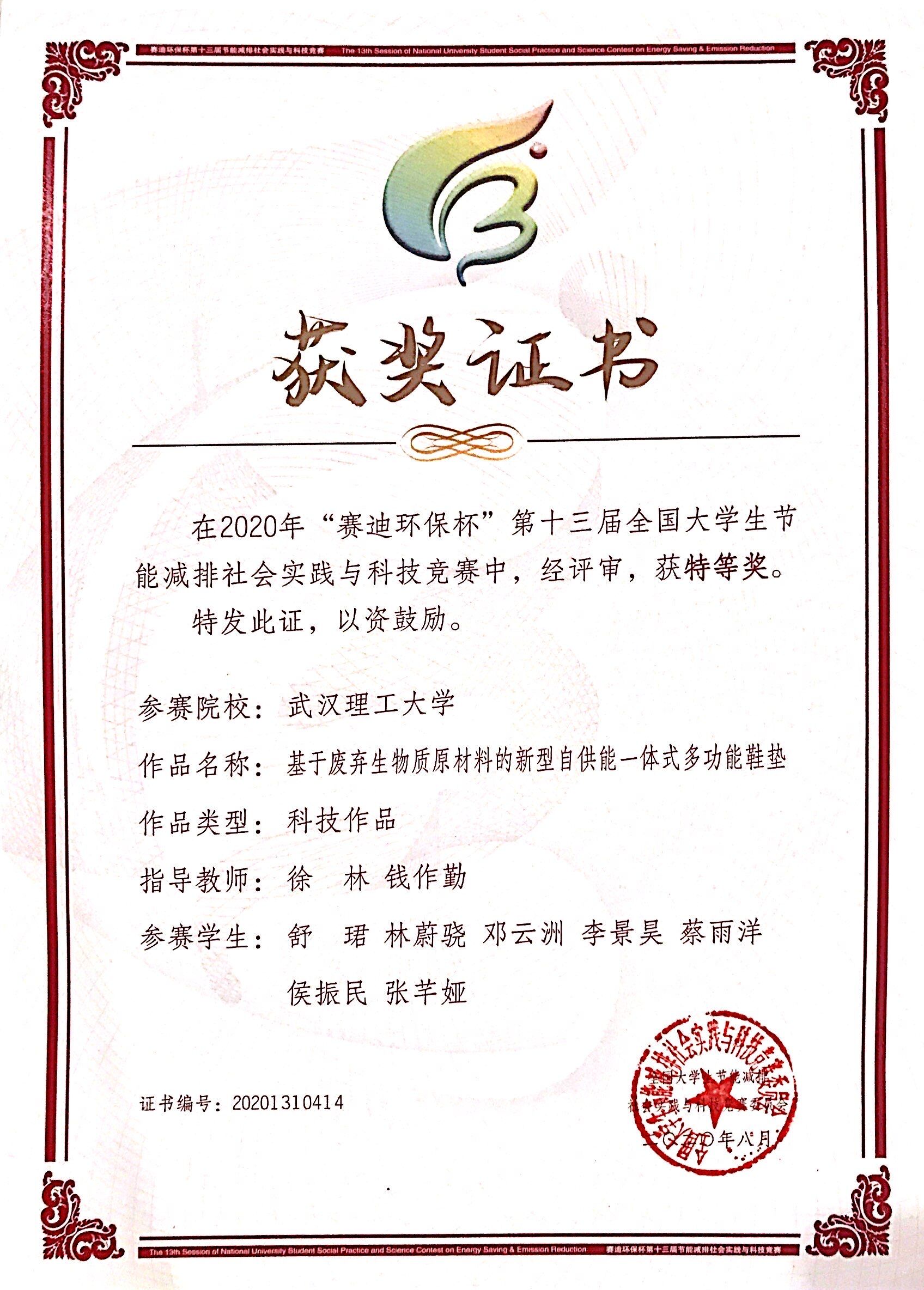 8月29日,由教育部高教司主办,并委托教育部高等学校能源动力学科教学指导委员会举办,重庆大学承办的2020年“赛迪环保杯”第十三届全国大学生节能减排社会实践与科技竞赛决赛落下帷幕。成人动作片 报送的参赛作品《基于废弃生物质原材料的新型自供能一体式多功能鞋垫》(指导老师:徐林、钱作勤,团队成员:舒珺等)荣获特等奖,实现新突破。