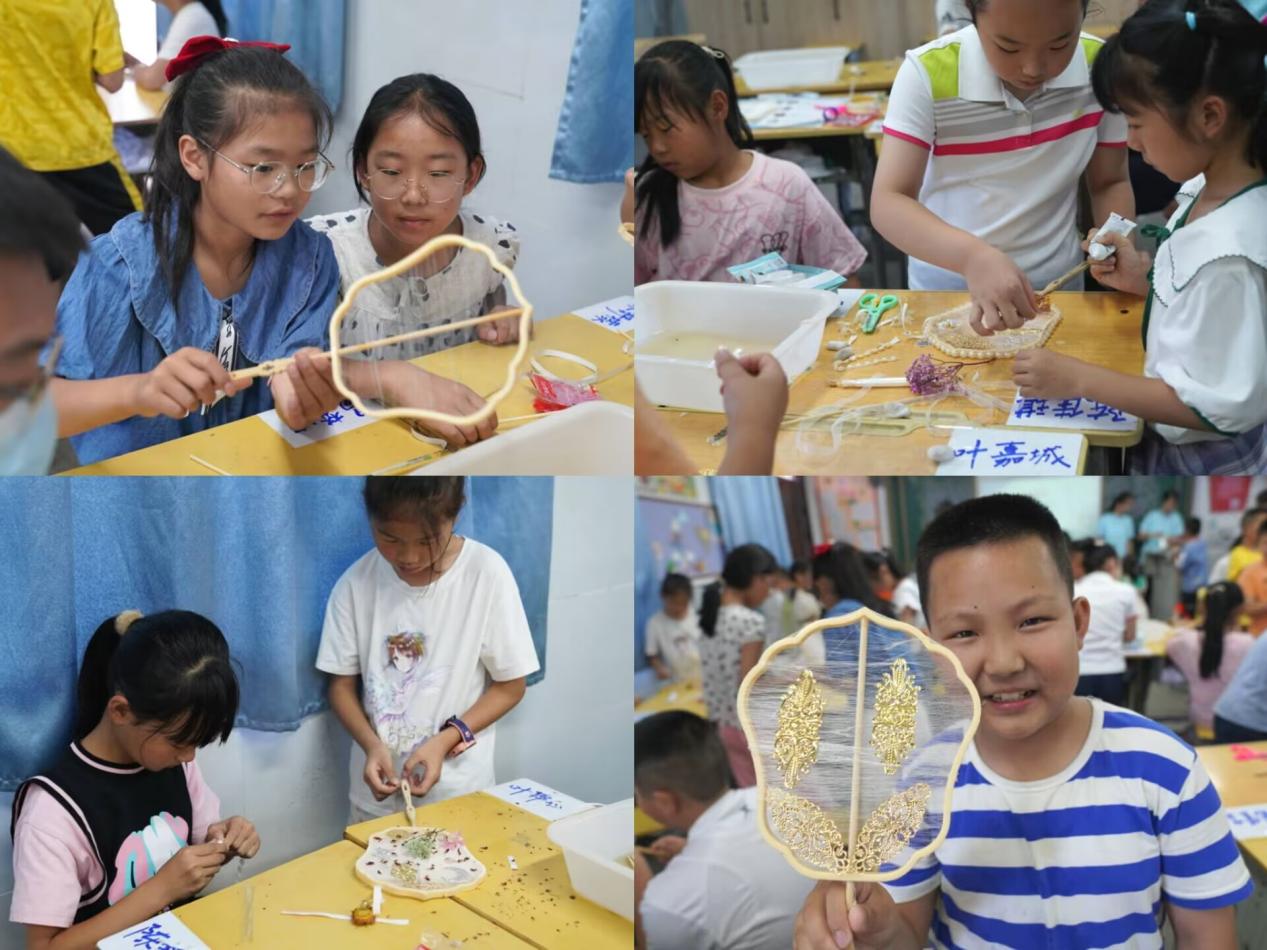 在学习了蚕丝扇的制作流程之后,同学们两人一组,开始制作自己的蚕丝扇。同学们分工明确,一人挑出丝头,一人将丝缠上扇骨。一圈、两圈、三圈......晶莹的丝线轻快舞动,与孩子们的欢声笑语,老师们的欵语温言,快速的交织在一起,渐渐绕成了扇面的形状。